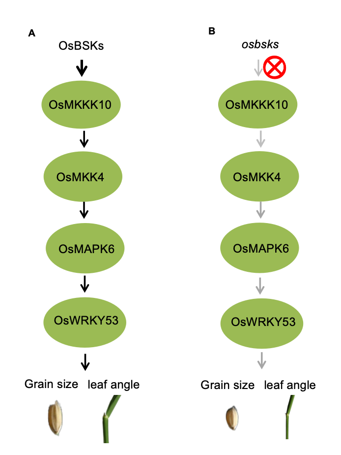 图1. OsBSKs-OsMKKK10-OsMKK4-OsMAPK6-OsWRKY53调控水稻粒型和叶角的模式图