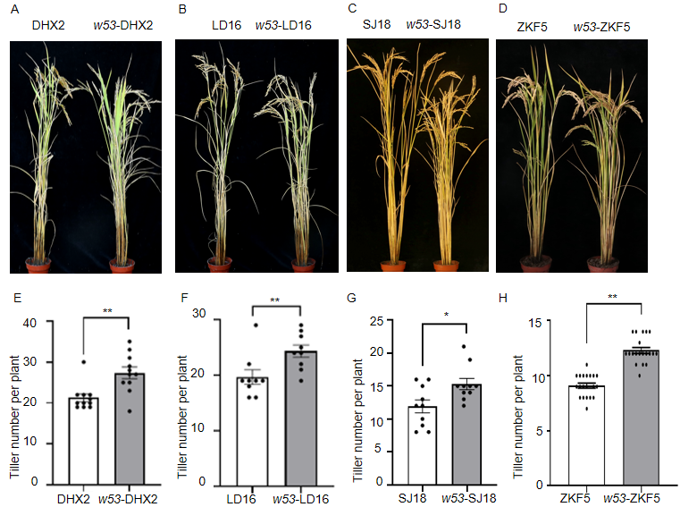 图1. 不同背景下oswrky53材料分蘖数均显著增加