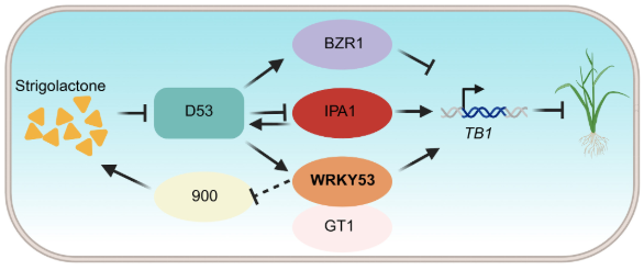 图2. OsWRKY53调控水稻分蘖及微调独脚金内酯信号的模式图