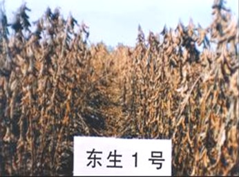“东生1号”是2003年黑龙江省农作物品种审定委员会审定的大豆品种(黑审豆2003017)。该品种为亚有限结荚习性,幼苗拱土能力强,根系发达,茎秆强度中等,株高70厘米左右,百粒重20克左右,生产试验平均亩产170公斤以上,较对照主栽品种增产14%,生育期114天左右,需活动积温为2360°C左右,适于黑龙江省第三积温带大豆主产区种植。该品种籽粒圆形,种皮黄色,有光泽,脐无色,商品品质高,市场收购价较普通大豆每公斤高出0.5-0.7元,属于国产非转基因大豆中的佼佼者。此外,该品种籽粒蛋白质含量41.3%,属高蛋白大豆品种,豆浆豆香浓郁,更是加工优质芽豆的首选品种,深受广大农户和小型加工企业欢迎。