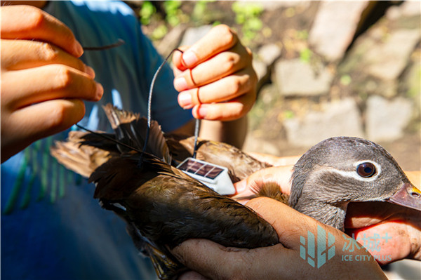 【冰城+ 客户端】兆麟公园两只雌鸳鸯佩戴卫星追踪器