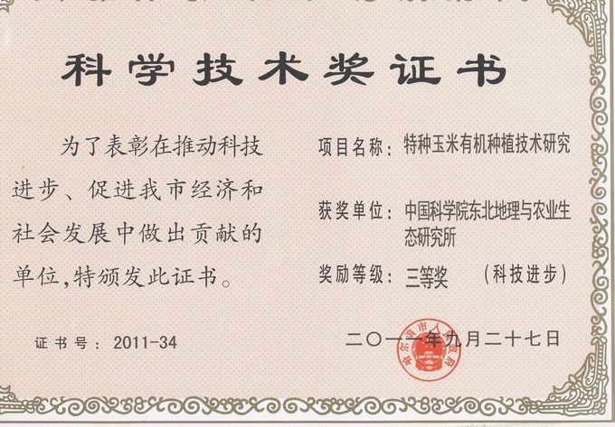 近日,由赵军研究员及所在课题组完成的 “土壤肥力预警与施肥指导系统3S应用技术研究” 获得哈尔滨市科技进步二等奖;王占哲研究员完成的“特种玉米有机种植技术研究”、赵恒田研究员完成的“蕨类山野菜孢子无菌培养与快繁技术研究”获得哈尔滨市科技进步三等奖。