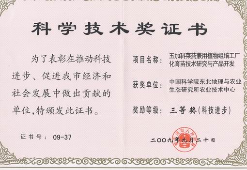 赵恒田研究员承担的“五加科菜药兼用植物组培工厂化育苗技术研究与产品开发”获哈尔滨市科技进步三等奖。