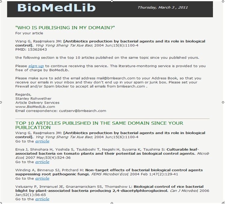BioMedLib是生物医学科技搜索引擎。在MEDLINE数据库发表的上亿篇生物医学科技论文中,自动评测出相关领域中发表的十大最佳论文(Top 10 Articles Published in the Same Domain Since Your Publication)。我所王光华研究员于2004年发表在《应用生态学报》上论文“Antibiotics production by bacterial agents and its role in biological control”(2004, 15:1100-1104)和2009年发表在FEMS Microbiology Ecology上的论文“Novel cyanophage photosynthetic gene psbA in the floodwater of a Japanese rice field” (2009, 70:79-86)最近被评为同领域研究十大最佳论文。