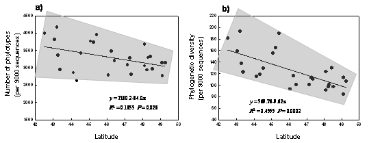 东北黑土是我国重要的土壤资源,在保障国家粮食安全和生态安全上具有重要地位。由于受气候、开垦年限和农田管理措施等的影响,东北黑土农田土壤养分含量,特别是土壤有机质含量呈现规律性的地理分布,即总体呈现南低北高的趋势。但对于黑土土壤微生物是否也存在着地理分布格局?如果存在,其驱动因素是什么?还不清楚。为此,东北地理与农业生态研究所农田分子生态学科组王光华研究员等人,于2012年从东北黑土带上基于土壤有机质含量的差异,南起辽宁昌图北至黑龙江讷河,采集了26个农田土壤样品,采用454高通量测序技术成功地解析了东北黑土细菌群落结构的地理分布规律及其驱动因素。研究共获得35万多条细菌序列,包括至少35个细菌类群,其中酸杆菌门(Acidobacteria)、放线菌门(Actinobacteria)、变形菌门(Proteobacteria)、拟杆菌门(Bacteroidetes)、绿湾菌门(Chloroflexi)、芽单胞菌门(Gemmatimonadetes)和浮霉菌门(Planctomycetes)等7个菌门细菌为黑土农田优势微生物(平均丰度>5%以上)。研究还发现绿湾菌门、芽单胞菌门和浮霉菌门细菌的相对丰度在黑土农田中较以往报道的其它土壤中高出5倍以上。本研究未发现普遍报道的现象,即土壤酸杆菌门丰度与土壤pH值具有显著的相关性,但发现黑土农田中酸杆菌门中亚门1和3与土壤pH成显著负相关,而亚门4、5、6、7和25则与土壤pH成显著正相关关系。研究结果揭示出东北黑土农田细菌群落结构组成、多样性及优势细菌门的相对丰度受土壤pH和土壤有机质含量的双重影响,且土壤pH的作用强度大于土壤有机质(图1)。此外,地理距离也是影响黑土农田细菌群落结构的另一重要因素(图2),黑土农田细菌群落结构组成存在明显的地理分布格局,低纬度低有机质含量的黑土,虽然土壤微生物量小,但高纬度高有机质含量的黑土相比具有更高的土壤细菌多样性(图3)。