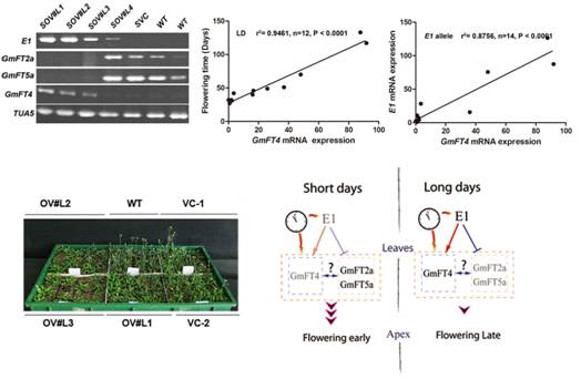 我所大豆分子设计育种重点实验室夏正俊研究组继成功克隆了大豆生育期基因E1(ProcNatlAcad Sci,10.1073/pnas.1117982109)后,对E1基因的作用机理方面取得了新的进展。发现了一个与E1表达相关联基因GmFT4。在不同的大豆品种中,E1的基因型及表达量都与GmFT4的表达量显著相关。GmFT4在长日条件下诱导表达,并呈现一定的节律性,且这种节律受光调节,但在短日条件下表达受抑制。近年来研究表明FT蛋白为被子植物中“成花素”,在植物叶中产生,通过输导组织运输到茎顶端分生组织,促进植物开花。GmFT4虽然属于FT家族蛋白,但功能与GmFT2a/5a相反,是大豆开花的抑制因子。将GmFT4在模式植物拟南芥中过量表达可抑制拟南芥开花。据此推测,GmFT4可能在E1调控大豆开花通路中起重要作用,同时提出了“大豆中开花抑制因子GmFT4与开花促进因子GmFT2a/5a之间的平衡,决定着大豆的开花与成熟”。