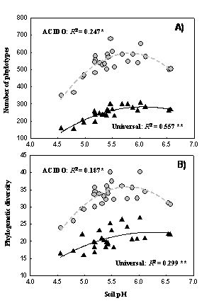 图2. 黑土农田酸杆菌多样性与土壤pH值关系。灰色圆圈是采用酸杆菌特殊引物MiSeq测序结果,