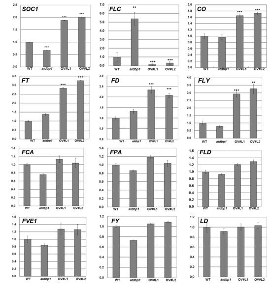 图2. 开花途径节点基因在AtDBP1过表达植株与敲除的突变体中的表达分析