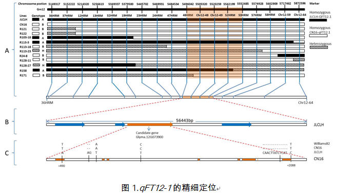 东北地理所大豆分子设计育种实验室夏正俊研究团队在利用栽培品种与农家品种杂交制备了一个遗传群体,在12号染色上定位调控生育期的主效QTL位点qFT12-1,并通过图位克隆法成功地鉴定了调控qFT12-1的生物钟基因GmPRR7。该基因含CCT结构域,属于生物钟调控基因TOC1基因家族。表达分析表明因GmPRR7及同源基因在表达上呈明显的日节律性变化规律。在野生及栽培大豆品种间的等位变异分化表明,GmPRR7与大豆的驯化关系密切。本研究成果揭示了生物钟基因与大豆光周期反应之间的内在联系,丰富了人们对大豆光周期调控机制的认识,同时为大豆分子设计育种提供重要的分子元件。