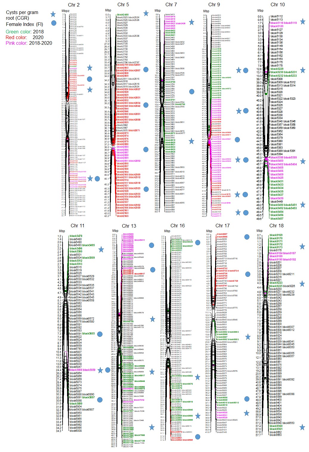 CSSLs是通过供体亲本多次反复与轮回亲本回交,然后经基因组标记辅助选择后自交获得的群体,染色体片段的代换能够通过表型的检测准确的定位与性状是否相关。因此,通过表型筛选CSSLs可以有效地识别并鉴定微效或主效QTLs。该研究所用CSSLs群体是利用野生大豆ZYD00006为供体亲本,黑龙江省当地的主栽品种绥农14为回交亲本的背景,这是我国东北目前唯一一个大豆代换系群体,同时这两个亲本的根重差异比较大,所以是用来评价每克根重孢囊数的理想群体。该研究通过对162个代换系群体进行表型筛选和高通量测序,首次报道了大豆孢囊线虫每克根孢囊数(CGR)的QTL定位,也是首次利用CSSLs来评估大豆孢囊线虫雌虫指数FI和CGR的报道。表型鉴定发现代换系的FI和CGR分布范围很广,有超亲后代(图1);FI和CGR的相关性非常低,CGR和根重的相关性明显高于FI和根重的关系。利用单因素标记Kruskal-Wallis(K*)分析(P < 0.005)及多因子MQM定位方法(LOD > 2),总共得到了38个QTLs (图2),其分布覆盖了大豆的20条染色体,这些QTLs具有很强的加性效应,解释了SCN 5.6-15.5% 的FI表型贡献率,6.1-36.2%的CGR表型贡献率。其中有25个QTLs抗性来自于ZYD00006,13个QTLs来自于绥农14,表明感病的双亲对于超亲遗传都有贡献,同时间接解释了SCN抗性的复杂性及其与目前已经报道分布于所有染色体数量多于300个QTLs的原因。研究发现在缺少SCN主要抗性基因(如rhg1和Rhg4)的情况下,综合考虑FI、CGR及根重三者有利基因的组合可以有效抑制线虫繁殖,这对高效育种具有重要的指导意义。同时发现对SCN有耐性并适合于东北种植的具有绥农背景的代换系株系具有潜在的应用价值。