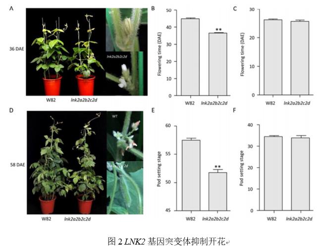 李赵博博士利用全基因组关联分析(Genome-wide association studies, GWAS)技术与拟南芥重要生物钟基因进行同源比对的方法,在大豆中鉴定到一调控开花期新基因LNK2 (Night light-inducible and clock-regulated 2)。利用CRISPR/Cas9开发出LNK2基因的转基因四重纯合突变体,在长日照条件下,四重突变体的开花时间明显早于野生型(图2)。荧光定量PCR显示,在长日照条件下,LNK2的转录水平明显低于野生型。LNK2促进了豆类特异性E1基因的表达,并抑制了开花素FT2a的表达。这些结果表明,CRISPR/CAs9介导的4个LNK2基因的靶向突变缩短了大豆的开花时间。