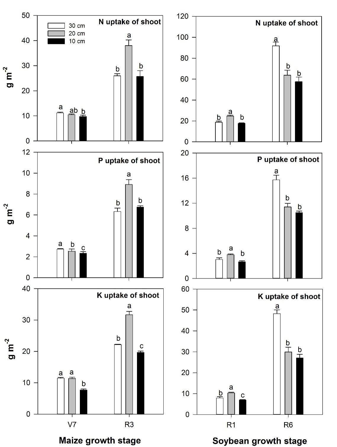图2. 2017年耕层厚度对玉米拔节期(V7)和乳熟期(R3)及大豆始花期(R1)和鼓粒期(R6)植物营养吸收的影响