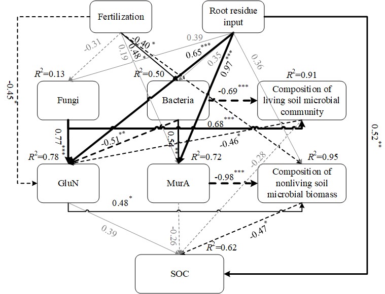 图2. 施肥和根茬输入量对土壤细菌和真菌生物量及其残体和土壤有机碳含量 的影响