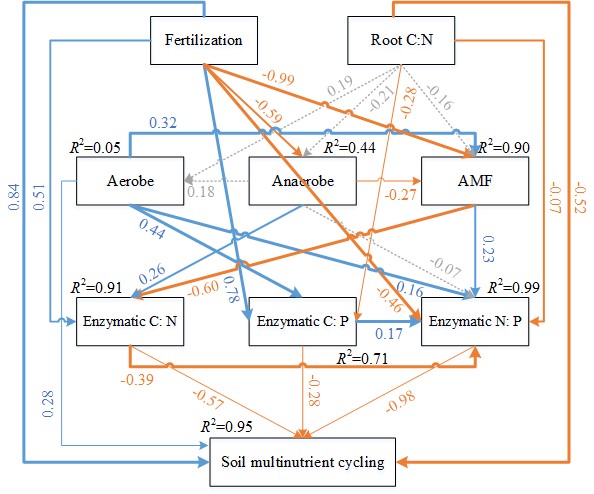 图3. 施肥和根茬输入碳氮比对土壤微生物量、酶化学计量比和养分循环的影响