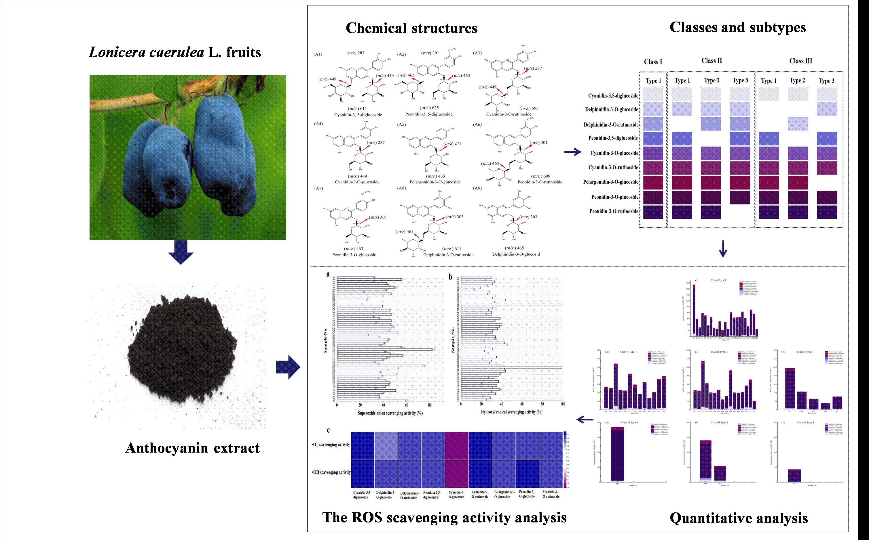 东北地理所研究团队,建立了准确高效的蓝靛果果实花青素定性、定量检测技术方法。基于该方法对我国东北林区蓝靛果果实花青素组成、含量进行系统检测分析,并利用灰色关联分析统计方法研究了不同种类花青素含量与自由基清除活力的相关性。研究发现我国东北林区蓝靛果果实花青素主要有九种。不同种质蓝靛果可根据果实中花青素种类不同分为3大类,7个亚类。不同种质蓝靛果果实总花青素含量分布符合正态分布,含量变化范围为100g鲜果中花青素含量为158.44 mg~1751.44 mg。基于正态分布曲线,建立了蓝靛果果实花青素含量分级评价标准。蓝靛果果实花青素中矢车菊素-3,5-双氧葡萄糖苷含量与羟基自由基和超氧阴离子自由基清除活力最相关(图1)。该研究为高花青素含量和高抗氧化活性蓝靛果新种质选育提供重要参考,也为以蓝靛果果实为原料开发抗氧化功能食品或药品提供理论依据。