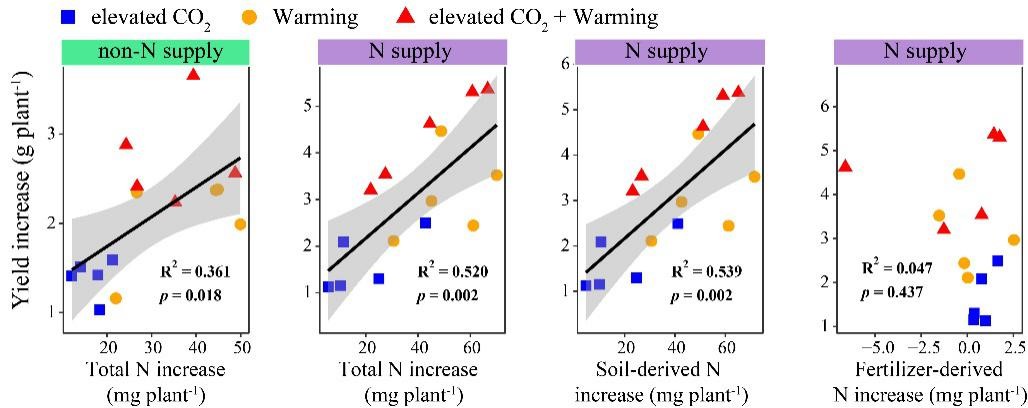 图3 大气CO2浓度和温度升高条件下,氮吸收增加量与产量增加的相关性
