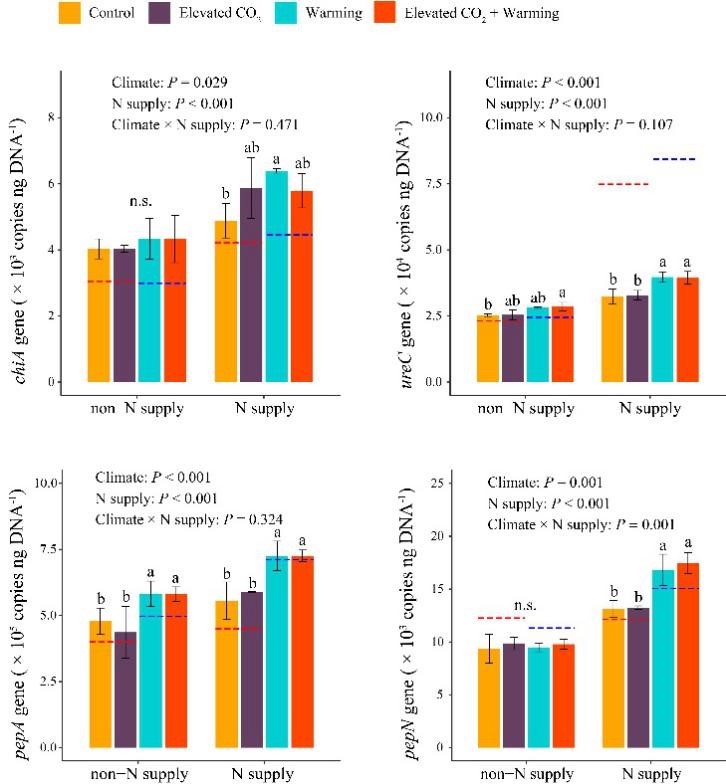 图5 大气CO2和温度升高条件下chiA、ureC、pepA和pepN基因的丰度