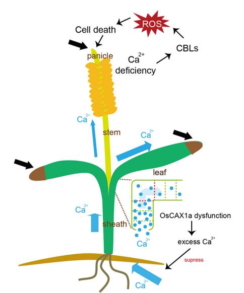 近日,安徽省农业科学院水稻研究所倪大虎团队和中国科学院东北地理与农业生态研究所方军团队在Plant, Cell & Environment(中科院一区TOP)上发表了题为“Ca2+ Deficiency Triggers Panicle Degeneration in Rice Mediated by Ca2+/H+Exchanger OsCAX1a”的研究论文,发现水稻也怕“缺钙”,详细阐述了OsCAX1a在水稻钙离子运输和分配中的重要作用,探究了钙缺乏诱发水稻颖花退化的内在机理(图1),为进一步精准施肥提高水稻的产量打下了基础。