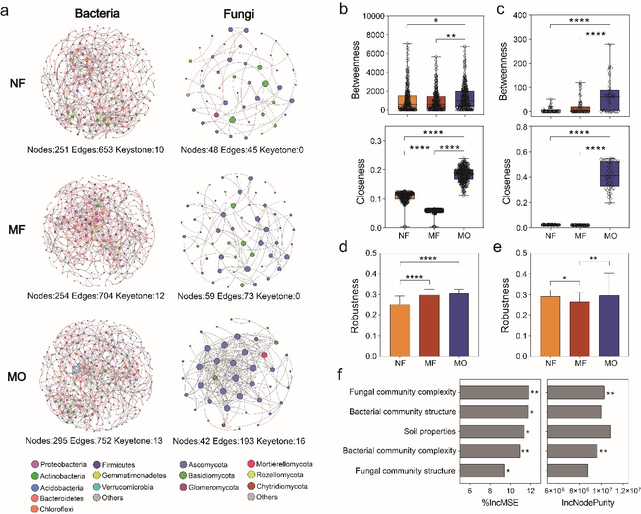 图2 细菌和真菌共现网络(a)、网络特征(b, c)及群落稳健性分析(d, e),基于随机森林量化土壤属性和微生物群落特征对玉米产量的相对影响(f)