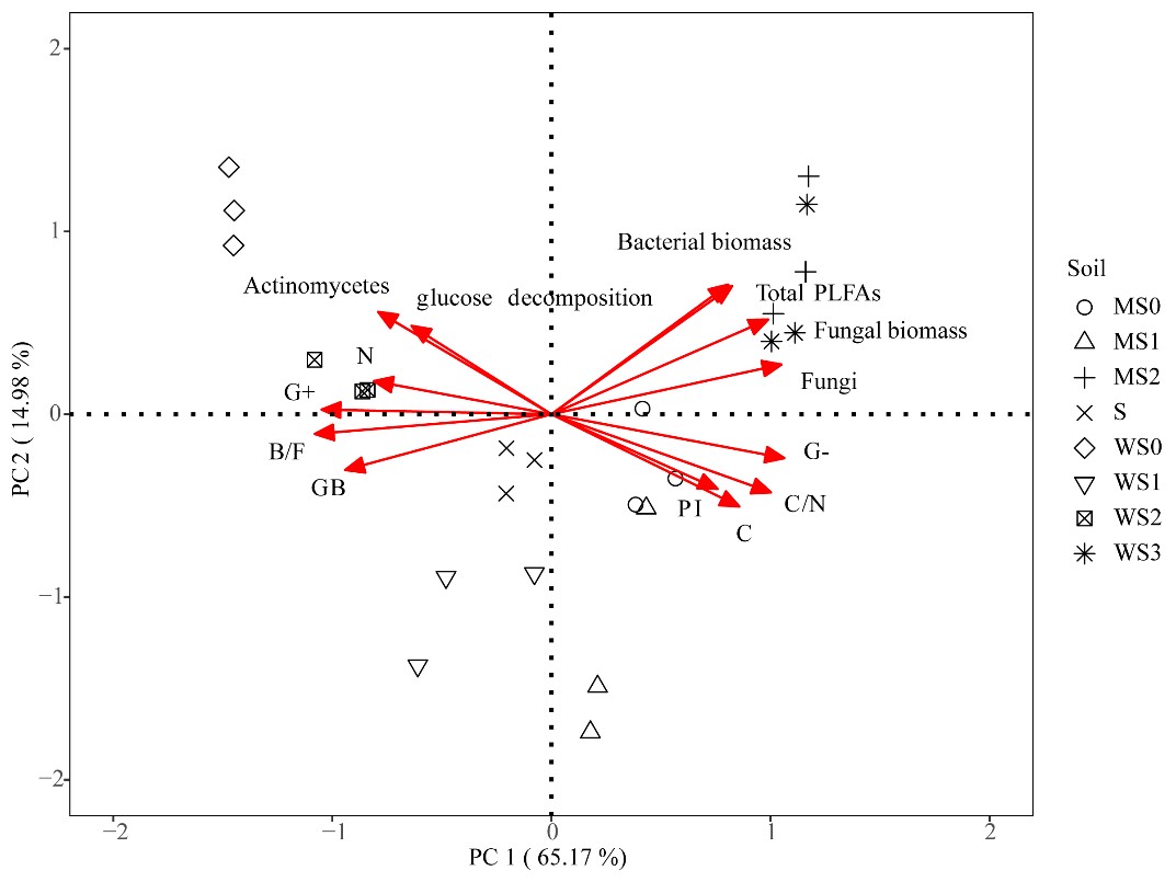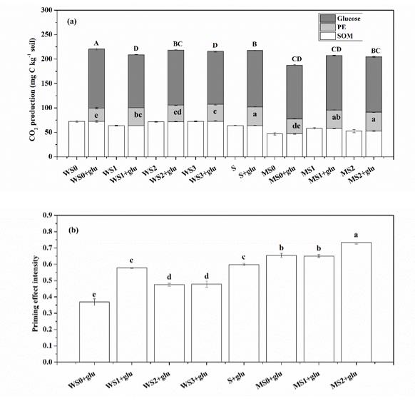 研究表明,在连作系统中,小麦连作土壤具有最高的土壤有机碳矿化速率,其次是大豆连作,玉米连作的土壤有机碳矿化速率最低。与未添加葡萄糖的处理相比,葡萄糖添加分别使小麦和玉米轮作系统中土壤累积碳矿化增加了195%–230%和255%–300%(图1a)。大豆参与的小麦和玉米轮作系统中,葡萄糖添加引起的激发效应分别比小麦和玉米连作增加了27%–38%和22%–26%,但大豆种植频率对小麦和玉米轮作系统中PE的影响不显著(图1)。在小麦和玉米轮作系统中,大豆的参与增加了土壤C/N比及真菌生物量,降低了土壤细菌/真菌的比值,促进了土壤激发效应的强度(图2),但大豆种植频率对土壤有机碳激发效应的影响不显著。研究结果为通过调整豆科作物参与的轮作体系促进土壤碳固定提供了科学依据。