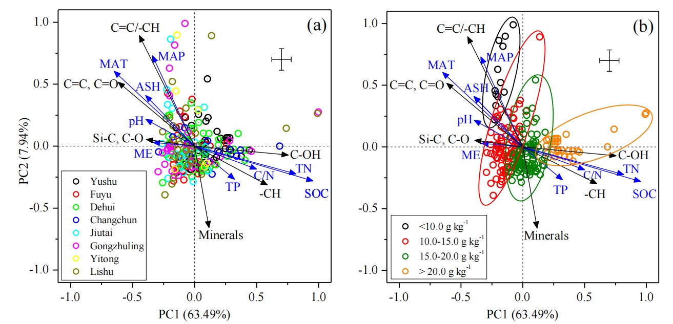 东北地理所土壤物质循环学科组研究人员利用在东北典型黑土带吉林省范围内采集的234个表层土壤样品,通过傅里叶红外光谱技术,结合气候和地形因子,阐明了典型黑土有机质量质变化的空间分布特征及主要驱动因素,解析了土壤有机质化学官能团组成对土壤有机质稳定性的调控机制。研究结果表明,典型黑土带土壤有机碳含量变化范围是8.2 -34.5 g/kg,有机碳含量和活性较高的脂肪族碳官能团的相对丰度从南到北呈增加趋势,而稳定性较强的芳香族碳官能团丰度和芳香族碳/脂肪族碳比例呈递减趋势,多糖和矿物结合态碳官能团无明显区域性变化规律。主成分分析发现区域范围内土壤有机质化学官能团的差异不显著,但受土壤有机碳含量的影响更大,其中芳香族碳官能团与低有机质含量土壤显著相关,脂肪族碳官能团与高有机质含量土壤相关,说明东北典型黑土带南部气温较高、降水较大,低有机质含量的土壤中芳香族碳丰度越高,有机质的腐解程度越高(图1)。本研究为评价土壤有机质及其稳定性的空间分布提供了光谱学研究证据。