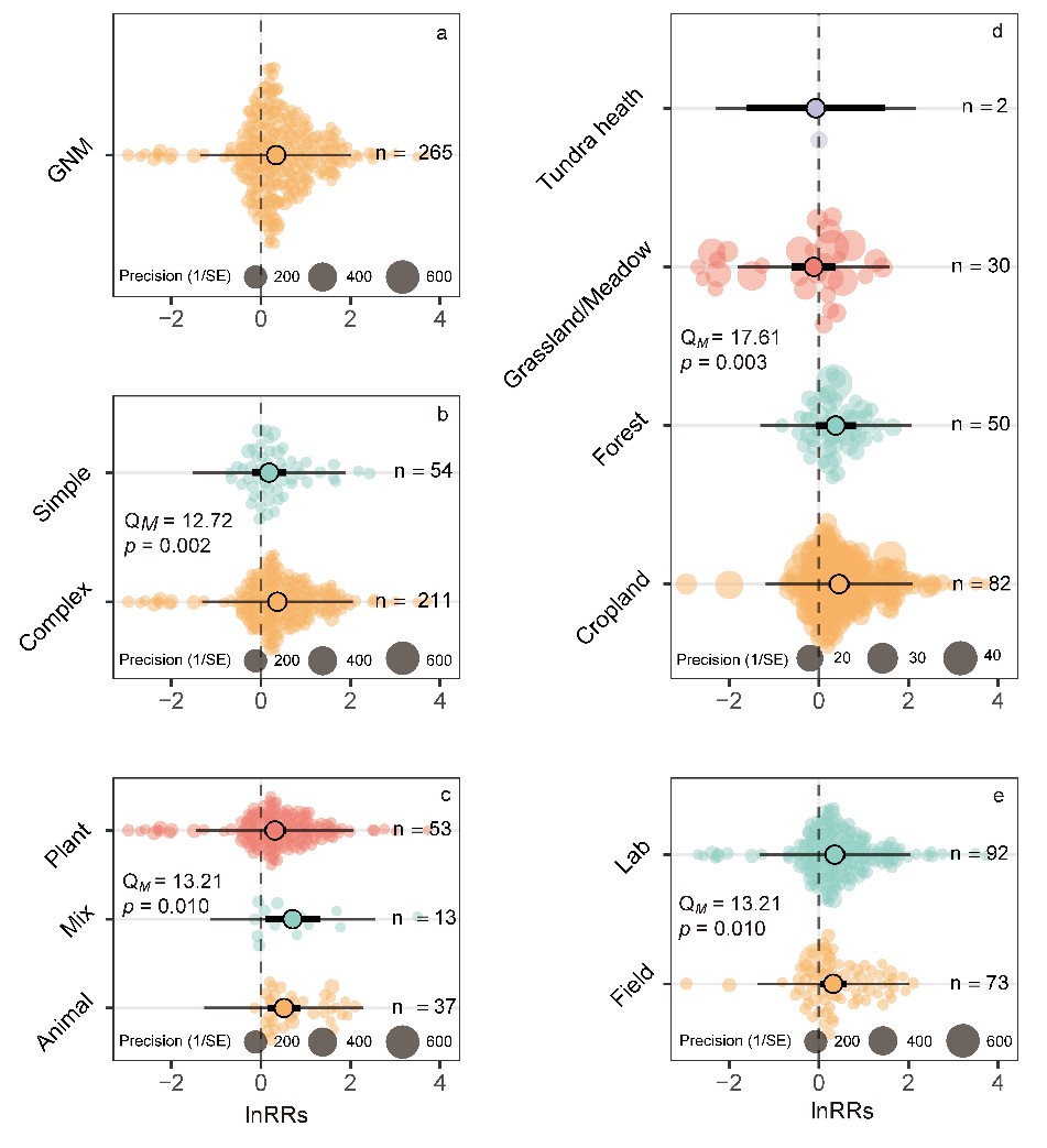 东北地理所土壤物质循环学科组研究人员在Web of Science和中国知网上检索了2021年9月10日前发表的相关文献,汇总了全球范围内63项研究的265组观测值,借助分层模型和方差-协方差矩阵,进行了土壤GNM对外源有机碳输入响应的meta分析,探讨了外源有机碳性质及环境因子对GNM的影响。