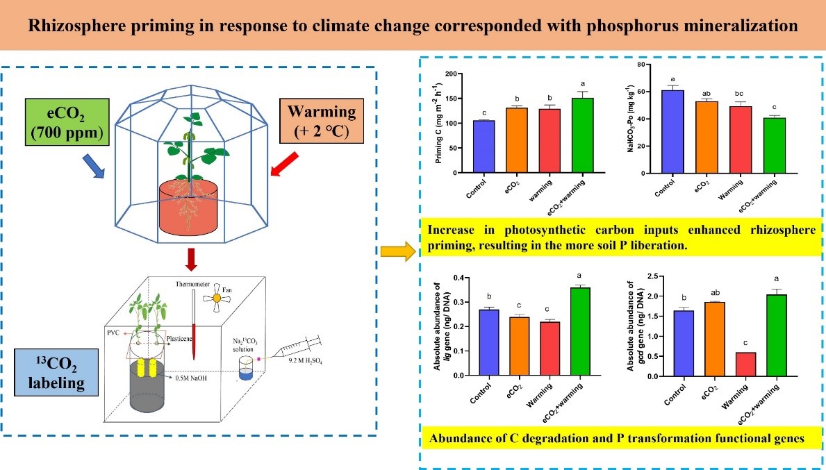 土壤有机质富含大量的有机磷素,土壤有机碳的矿化对磷素循环具有重要影响。大气CO2浓度和温度升高改变光合碳向土壤中的输送,刺激土壤微生物活性,加速土壤有机质的分解,可能释放更多的磷(P)进入土壤。然而,关于气候变化条件下有机碳分解与土壤磷矿化的关系仍不清楚。因此,研究气候变化背景下磷素转化的影响以及相关功能微生物过程对应对气候变化的农田土壤健康和养分管理至关重要。