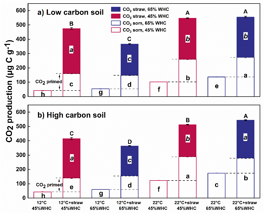 为此,东北地理所土壤物质循环学科组李禄军团队研究人员以东北农田黑土为研究对象,通过微宇宙控制实验,利用13C稳定同位素示踪技术,深入探究土壤温度(12°C和22°C)和湿度(45%WHC和65%WHC)及其耦合作用对土壤有机质激发效应及其温度敏感性的影响。