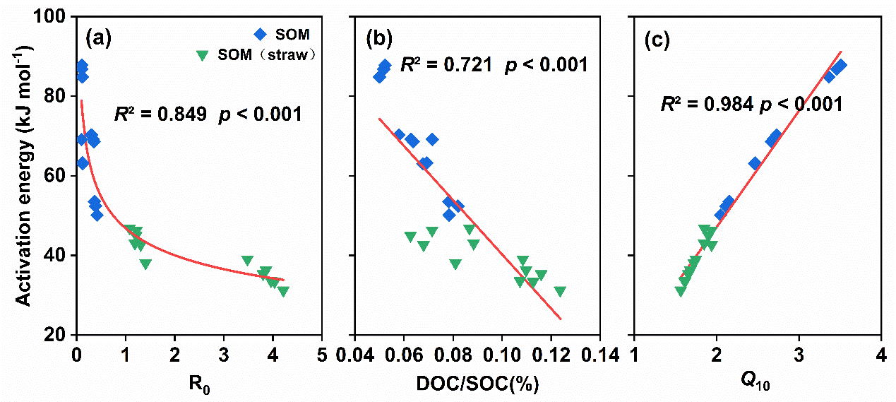 图2 土壤有机质矿化活化能与土壤碳质量及温度敏感性相关关系