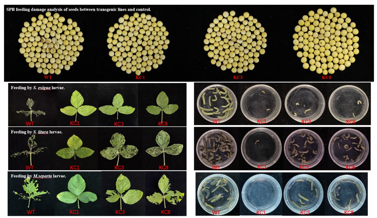 近日,东北地理所农田有害生物控制学科组孟凡立研究员团队在高油大豆品种垦农18中表达cry1C*基因,显著提高了受体对大豆食心虫等鳞翅目害虫的抗性。在田间网室接虫条件下,表达cry1C*转基因大豆虫食率降至5%以下(图1)。与取食受体叶片的幼虫相比,取食转基因叶片的甜菜夜蛾(S. exigua)、斜纹夜蛾(S. litura)和黏虫(M. separata)幼虫生长受到显著抑制,体重明显降低,存活率显著降低。利用southern blot 和全基因组重测序技术进一步确定了转基因株系KC1的T-DNA拷贝数和插入位点。转基因株系KC1已在黑龙江省完成转基因生物安全评价环境释放试验,为大豆转基因抗虫产业化奠定基础。