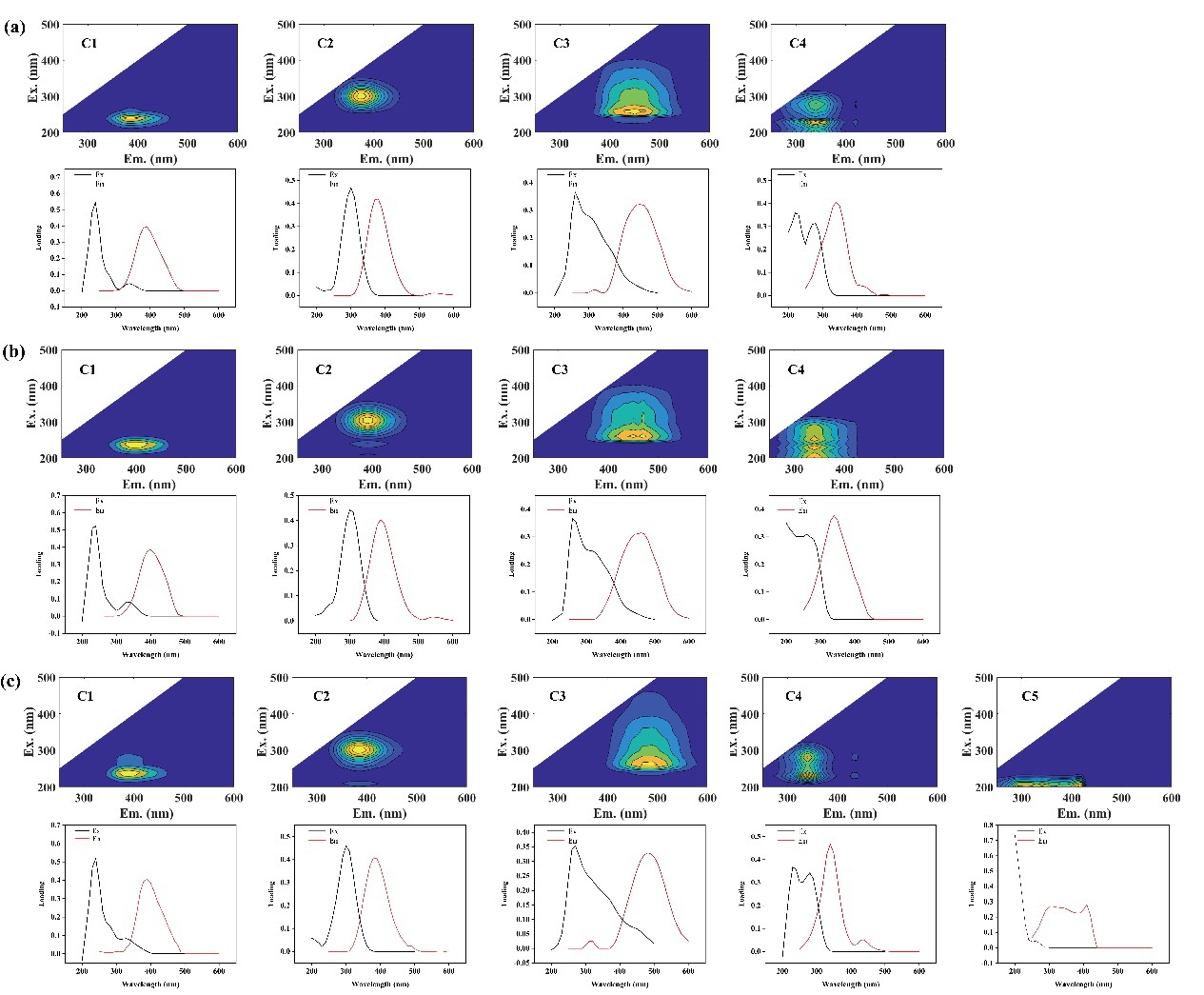 图1. 通过平行因子分析法(PARAFAC)确定的水溶性有机质(a),富里酸(b)和胡敏酸(c)的荧光组分