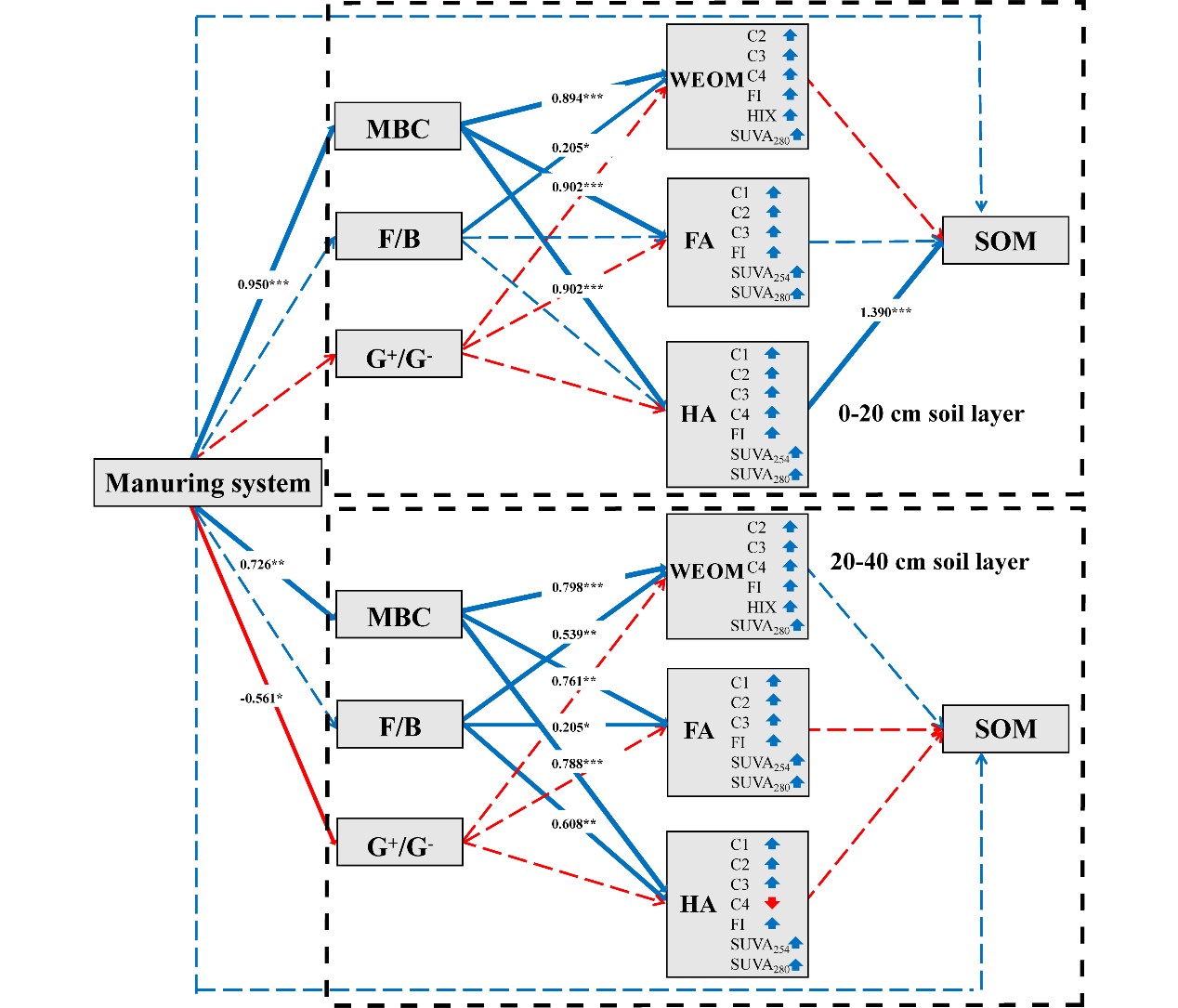 为此,东北地理所黑土保护与利用学科组研究人员利用长期定位实验和三维荧光光谱、紫外光谱以及磷脂脂肪酸等技术,探究了长期施用有机物料对黑土溶解性有机质结构的影响。研究结果表明,长期施用有机物料可显著提高SOM含量,且有机肥处理的效果优于秸秆还田。施用有机物料不仅提高了WEOM的芳香性,还显著增加了HA和FA中的类富里酸和类胡敏酸组分,并通过增加稳定成分来提高SOM的稳定性(图1)。此外,微生物群落的变化进一步凸显了秸秆还田和有机肥对土壤微生物生物量的不同影响,其中有机肥处理表现出更高的磷脂脂肪酸(PLFAs)增长幅度。这表明有机物料对微生物群落有多方面的影响,真菌和细菌在土壤有机质的形成中发挥重要作用(图2)。此外,长期施用有机物料对土壤WEOM、FA和HA的影响与土壤微生物生物量碳(MBC)和微生物群落结构密切相关。这种作用使其组成逐渐与微生物代谢相一致,强调了真菌和细菌的整体作用。偏最小二乘路径模型(PLS-PM)分析显示,HA和FA主要影响0-20 cm土层有机质含量的增加,而WEOM对20-40 cm土层有机质含量的增加起主导作用(图3)。该研究通过探索长期施用有机物料对于土壤有机质含量和结构的影响,有助于深入了解微生物群落如何影响土壤中不同有机质组分的含量和结构。