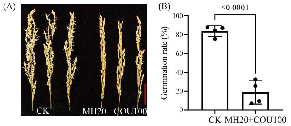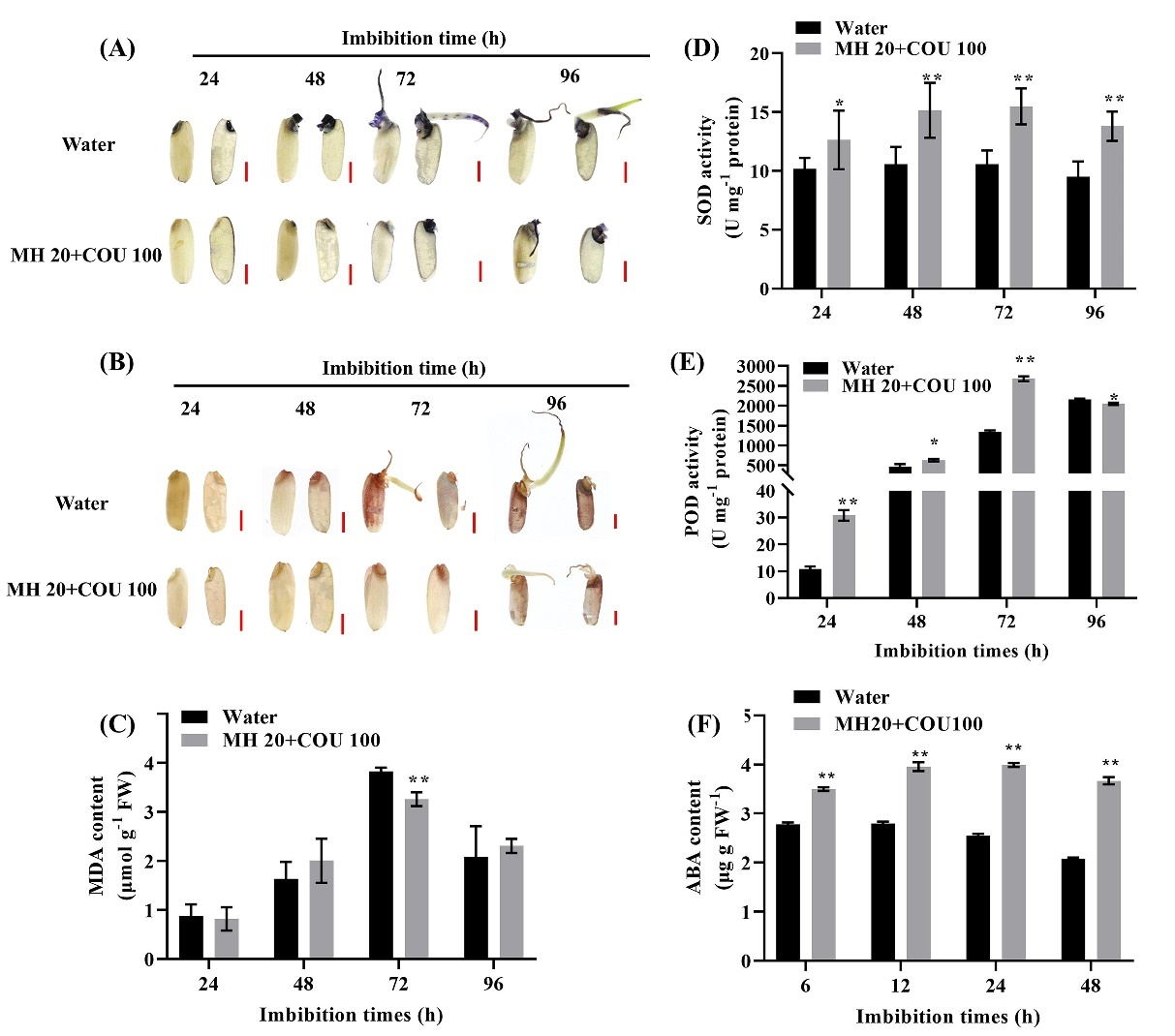 研究团队通过连续和短期浸种实验,从马来酰肼(MH)、香豆素(COU)和丁香酚(EUG)三种穗发芽抑制剂中筛选出穗发芽抑制剂的最佳组合为MH 20 mg L-1 + COU 100 mg L-1,该组合可显著降低水稻种子发芽率。进一步研究表明,该组合处理显著降低了种子萌发过程中的α-淀粉酶活性,减少了可溶性糖和可溶性蛋白的含量,从而抑制了种子萌发所需的能量和物质供应。该组合还能调节抗氧化酶活性,抑制活性氧(ROS)的积累,减少MDA的产生;促进种子内ABA含量快速积累(图1)。基因表达分析表明,MH和COU组合通过调节OsNCED1/2/5和OsABA8ox1-3表达,精准调节水稻种子内ABA的含量。在不同萌发阶段,该组合对ROS产生基因OsRbohs表达的调节不同,还下调了α-淀粉酶基因(OsAmy1A和OsAmy3D)的表达。体外模拟萌发试验进一步证实该PHS抑制剂组合能够有效降低种子萌发(图2)。