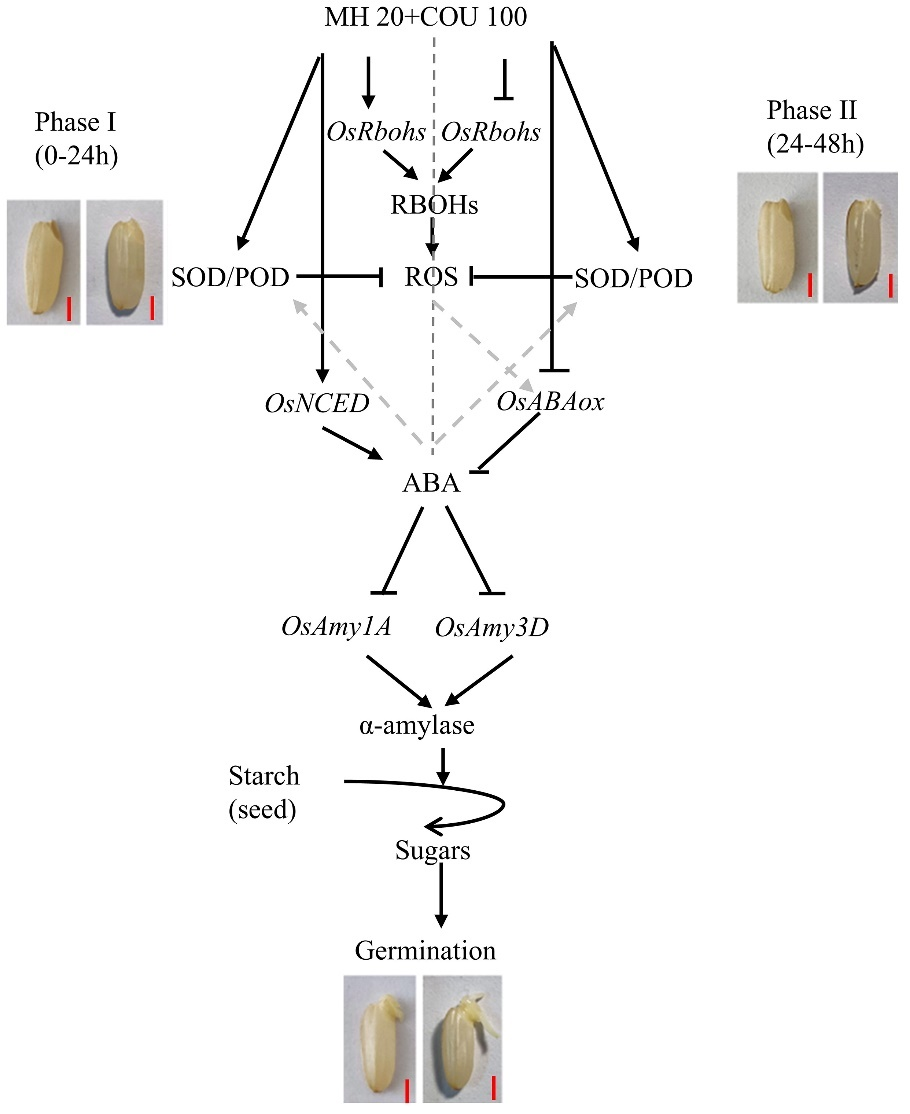 该研究首次报道了MH和COU复配对水稻种子萌发的协同抑制作用,揭示了其抑制水稻种子萌发的机制,涉及ROS积累、ABA代谢和淀粉降解等多个生理过程,并绘制了相应的机制模型(图3),研究成果不仅加深了对PHS抑制剂调控种子萌发机制的理解,也为MH和COU在防止穗发芽的应用中提供了理论支持,有望在农业生产中得到广泛应用。
