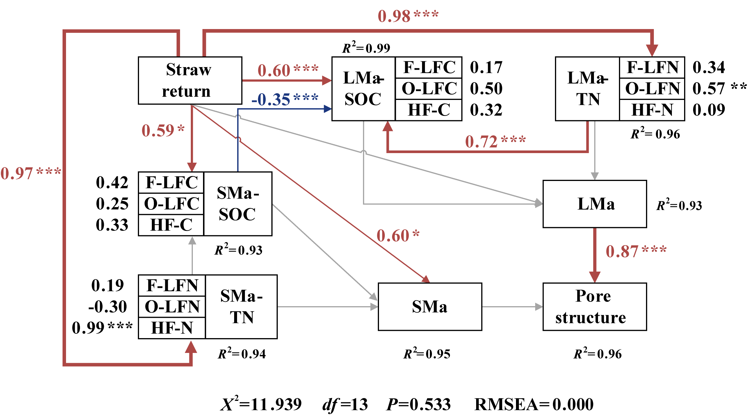 图1秸秆还田对团聚体内碳氮含量以及孔隙结构影响的结构方程模型