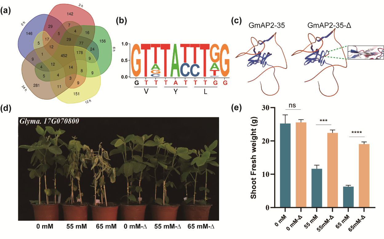 近日,东北地理与农业生态所农田有害生物控制学科组孟凡立研究团队,利用转录组数据鉴定大豆碱胁迫(pH=9.1)处理0h、3h、6h、12h和24h的微外显子序列,分析微外显子序列特点和参与编码的蛋白结构域(图1),系统解析了盐碱胁迫前后的大豆微外显子动态变化。以AP2转录因子家族为例,创制了9bp微外显子缺失以及正常转录本的转基因大豆材料,结果表明微外显子缺失在不改变蛋白质结构的条件下,增强大豆对盐碱胁迫的耐受性(图1)。该研究成果首次探究了微外显子在大豆响应盐碱胁迫的调控作用,为培育耐盐碱大豆新品种提供新思路。