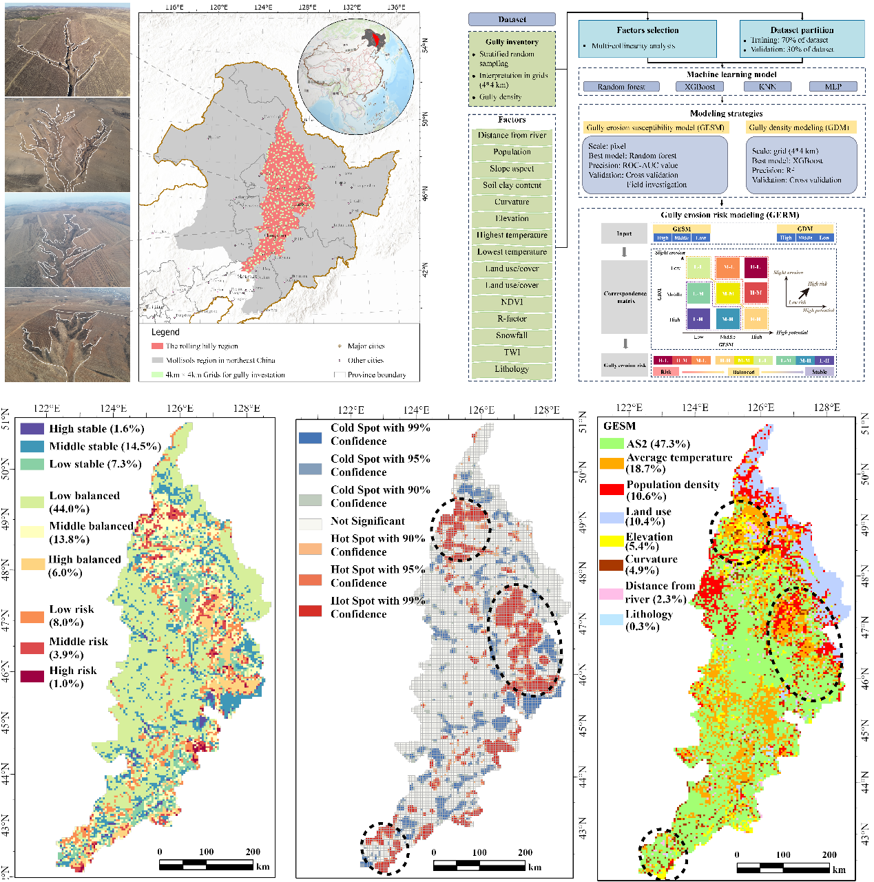 近日,东北地理所黑土退化与修复学科组郭明明研究团队提出了一种新的沟道侵蚀风险模型构建方法(GERM),该方法将沟蚀敏感性模拟与沟道密度模拟相结合,预测了漫川漫岗黑土区全区(17.76万 km2)的沟蚀发育风险。研究采用分层随机抽样方法选取了424个4×4 km2区域,通过0.3~0.6 m分辨率Google Earth影像对样方中的侵蚀沟进行解译,并抽取30%进行实地调查以保证解译精度。结果表明,漫川漫岗黑土区侵蚀沟平均长度为335.85 m,平均沟壑密度为250.35 m/km2。GERM综合考虑了Random Forest、XGBoost、KNN以及人工神经网络四种机器学习模型,结果显示XGBoost模型表现最佳(AUC=0.999)。全局莫兰指数表明沟蚀风险存在显著的空间聚类特征,漫川漫岗黑土区沟蚀高风险区面积占比高达12.9%,且这些风险区分布于全区的中东部、西北部和南部。此外,气候是驱动侵蚀沟形成的关键因素,地形和气候共同决定了全区沟蚀强度的空间异质性,而侵蚀沟未来进一步发育的风险则受控于地形、气候和人类活动的综合影响,其中汇水地形指数(AS2)、气温、人口密度、土地利用主控区域面积占比分别为47.3%、18.7%、10.6%、10.4%。南部风险区主要受AS2影响,东部风险区主要受AS2、气温、土地利用影响,东北部向小兴安岭过渡地带沟蚀风险主要受人类活动强度(土地利用和人口密度)的影响,而西北部风险区受控因素更为复杂多样。研究结果可为东北黑土区侵蚀沟防控与治理提供科学依据。