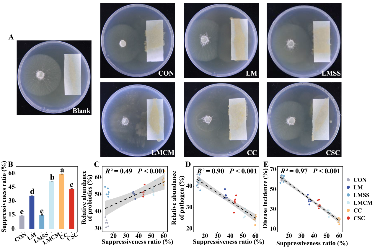 基于海伦水土保持监测研究站的田间定位试验平台,设置了对照(CON)、石灰(LM)、石灰秸秆配施(LMSS)、石灰牛粪配施(LMCM)、2%粗甲壳素(CC)及硅钙钾镁肥(CSC)6种改良处理,系统评估了其对土壤性质、微生物群落、大豆根腐病发病率及产量的影响。结果显示,改良剂能有效降低大豆根腐病发病率和提高大豆产量,其中CC抑病和增产效果最大,根腐病发病率降低70%,产量提高30%以上。土壤改良剂显著富集了具有抑病和促生功能的潜在有益物种,如Pantoea、Bacillus、Humicola、 Tausonia和Mortierella,同时减少了潜在病原菌(图1)。体外共培养实验进一步验证,改良土壤的根际细菌悬液明显抑制了病原菌菌丝的生长,且该抑病能力与富集的有益菌丰度呈显著正相关(图2)。土壤改良剂,特别是CC处理诱导了最高的微生物抗性,证实改良剂能够通过诱导健康的微生物区系来缓解连作障碍(图3)。本研究明确了“改良剂-微生物抗性-病害抑制-产量提升”的级联调控路径,为维持土壤健康和促进作物生产提供了理论依据。