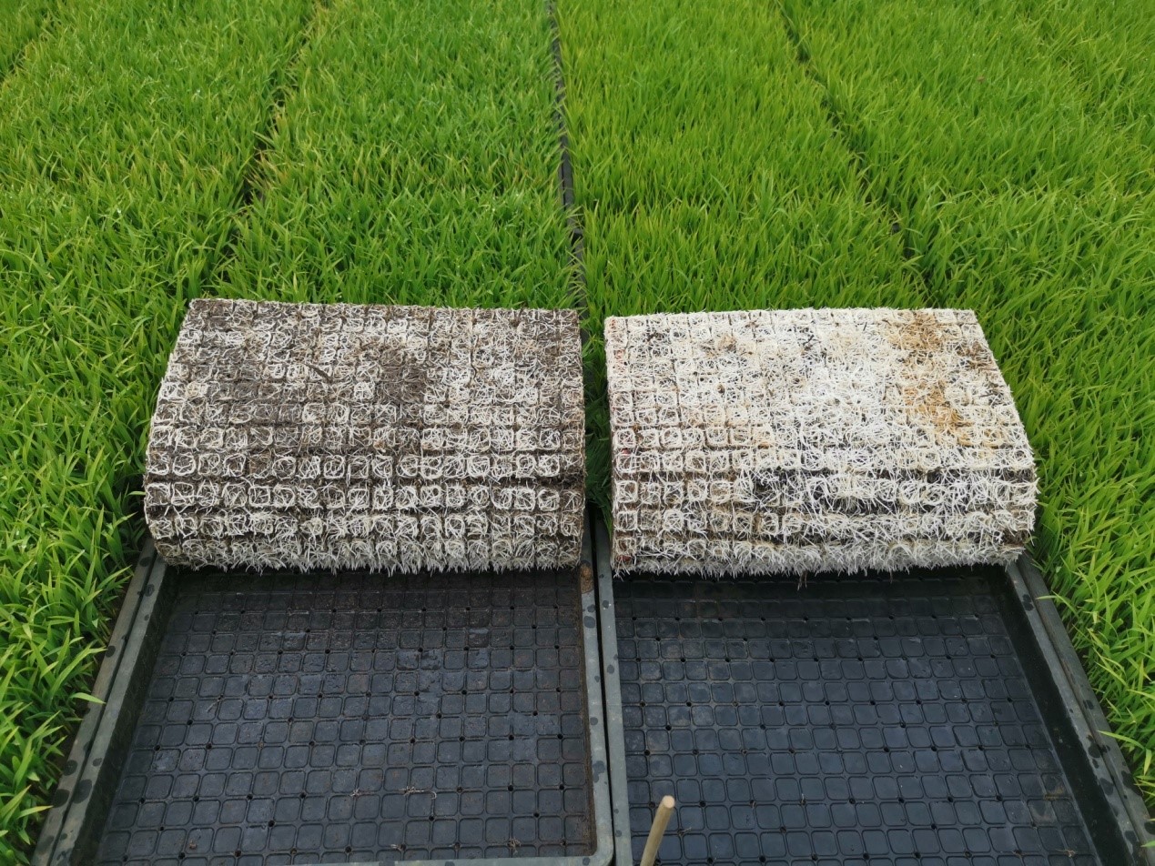 图2:常规育秧(左)与基质板育秧(右)根部对比