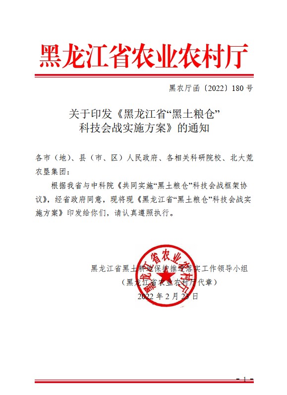 黑龙江省为我国黑土的主要分布区域,在保障国家粮食安全方面具有举足轻重的战略地位。为贯彻落实习近平总书记关于把黑土地用好养好的重要指示精神,深入实施“藏粮于地、藏粮于技”战略,积极响应《国家黑土地保护工程实施方案(2021-2025年)》《东北黑土地保护规划纲要(2017-2030年)》《东北黑土地保护性耕作行动计划(2020-2025年)》的总体部署,加快探索黑土地保护利用与促进粮食稳产增产新模式新路径。根据《中国科学院黑龙江省人民政府共同实施“黑土粮仓”科技会战框架协议》,黑龙江省黑土耕地保护推进落实工作领导小组于2022年2月23日正式印发了《黑龙江省“黑土粮仓”科技会战实施方案》(以下简称“实施方案”)。
