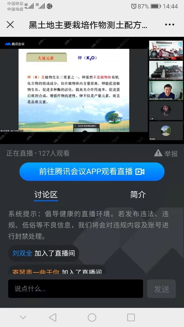 会议以腾讯会议和腾讯直播的方式开展,特别邀请了来自沈阳农业大学韩晓日教授、黑龙江省黑土保护利用研究院周宝库研究员、海伦示范区负责人邹文秀研究员、东北农业大学彭显龙教授、黑龙江省农业机械工程科学研究所刘希锋研究员和黑龙江省倍丰农业生产资料集团有限公司朱有利高级工程师等专家从肥料利用率试验与计算方法、玉米高效施肥技术、大豆需肥规律及施肥管理、寒地水稻养分综合管理技术、施肥机械的种类与应用和2022年黑龙江省化肥市场分析及选购建议等方面开展了详细的培训。各位专家针对2022年备春耕农用物资准备和作物科学施肥“出良方、献良策”,为2022年海伦示范区各项工作的开展奠定了良好基础。来自黑龙江省各市(地)、县(市)农业技术推广中心(总站)的农技人员,专业合作社,农民种粮大户,农村土地托管组织和基层肥料销售人员等480余人参加。