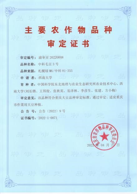中科毛豆3号最早于2019年由东北地理所张秋英研究员团队利用生理育种与辐射诱变育种等方法结合选育而来,通过黑龙江省大豆品种审定;2020年通过吉林省大豆品种审定。,此次该品种通过重庆市大豆品种审定,标志着该品种的适应性更强,可推广范围更广,该研究团队在大豆品种选育方面技术更加成熟。