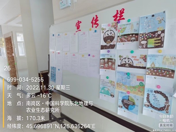 11月30日,土壤资源与利用学科组在哈尔滨所区宣传栏张贴了世界土壤日官方宣传海报,海报展示了2022年世界土壤日主题、土壤肥力形成与提升、土壤肥力与人体健康等内容,使哈尔滨所区职工和研究生对2022年世界土壤日有了更深的认识。此外,土壤资源与利用学科组在12月1日至3日期间,在疫情防控允许的条件下,在所住小区也进行了世界土壤日宣传海报的张贴,并为公共讲解世界土壤日的由来以及土壤在粮食生产的中的重要作用,促进了公众关注和保护土壤意识的提升。