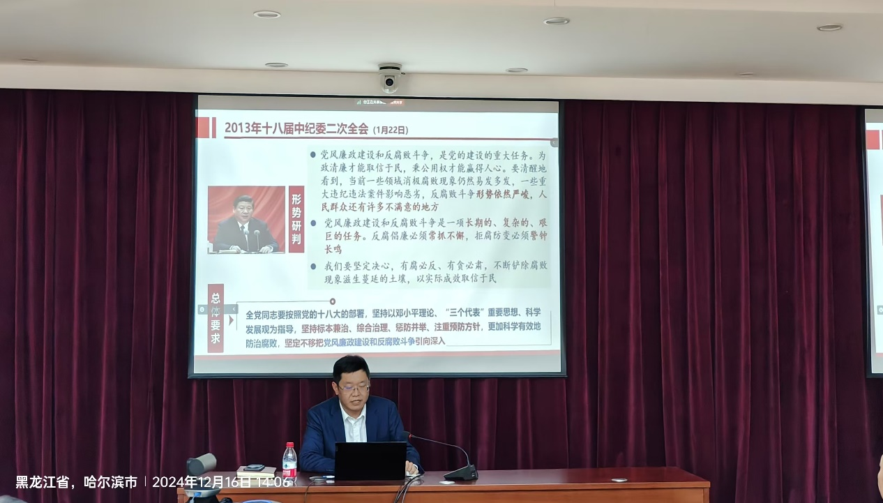 为进一步深化党风廉政建设,增强党员干部廉洁自律意识,12月16日,农业技术中心组织召开廉政警示教育专题报告会。东北地理所副所长、农业技术中心主任李向楠以“以案为鉴知敬畏 防微杜渐守底线”为题作专题报告,农业技术中心全体党员干部及关键岗位职工代表共90人参会。
