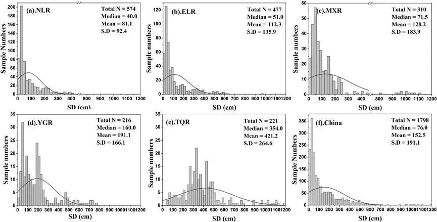 图2 不同湖区湖泊透明度频率直方图